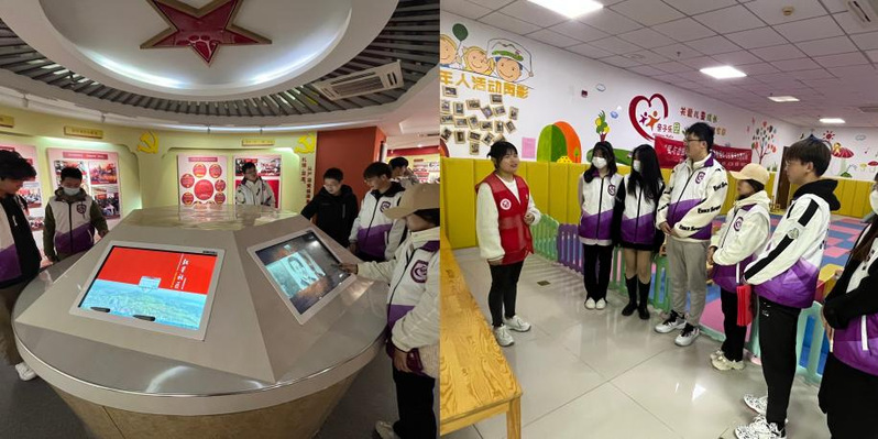 参观活动的第一站是康怡社区,该社区浓烈的服务氛围使每个参观成员倍受熏陶。热情的工作人员耐心的引导大家走进社区老年人食堂、盲人电影院、理疗室、图书室、活动室及儿童室,并详细介绍了社区的养老服务、幼儿托管服务以及志愿者服务等项目。老师和同学们认真聆听,感触颇深,并纷纷在我的南京App里的时间银行注册养老服务志愿者,为下一次开启社团志愿服务做好准备。随后,师生们一起来到了乌山社区的党史展厅,在这里学习党史故事,感受红色文化,进一步增强师生们传承红色基因,赓续共产党人精神的动力。最后,乌山社区的老年戏曲爱好者为师生们带来精彩的戏曲演唱,唱功字正腔圆、婉转悠扬,展现了新时代老年人在党的领导下丰衣足食、国泰民安的喜乐景象。