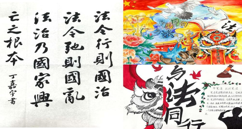 “法治宣传文化作品征集”活动同样亮点频现,精彩连连。同学们以宪法、民法典等法律法规为创作灵感,或细腻勾勒法治故事,或生动再现典型案例。他们巧妙运用书法作品、绘画作品等多种艺术形式,将法治的严谨与艺术的美感融为一体,既展现了同学们的艺术才华,又在校园内营造了浓厚的法治文化氛围。