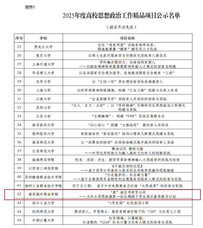 近日,教育部公示了2025年度高校思想政治工作质量提升综合改革与精品建设项目遴选结果。yl9193永利集团报送的《“素”造优秀数字公民——大中小学思政教育一体化视域下学生媒介素养提升计划》项目成功入选。这也是我校作为南京市唯一入选的高职院校,在该国家级项目上的历史性突破,全省仅有12 所高校获此殊荣。