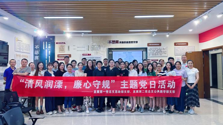 为强化思想引领、纯正政治生态、涵养清风正气,深入贯彻中央八项规定精神学习教育,切实增强党员廉洁从教与拒腐防变意识,6月24日下午,直属第一党总支思政部支部与直属第二党总支公共教学部支部携手开展“清风润溧・廉心守规”主题党日活动,共计43名党员参与。
