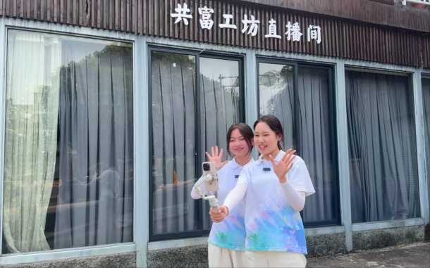 (团队成员在共富工坊前参与直播) | (团队成员访谈回村创业青年) |