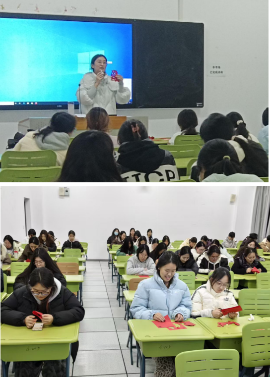 活动现场氛围热烈。首先,社团骨干通过生动地讲解与示范,向同学们普及剪纸的基本技巧。随后,成员们热情高涨,纷纷拿起工具投入创作。大家认真折叠红纸,按照模板勾勒轮廓,再小心翼翼地裁剪、雕刻。从简单的双喜字、雪花纹,到复杂的喜鹊登梅、连年有余,普通的红纸在同学们的指尖蜕变成为寓意美好的艺术作品。部分同学还发挥想象力,将校园风景、动漫形象融入剪纸,赋予传统艺术新的时代气息。最后,社团指导老师冷雅琳精心挑选了部分优秀作品进行现场展示和点评,造型精巧的剪纸作品不仅展现了大家的动手能力,更展现了社团成员们对传统文化的热爱。